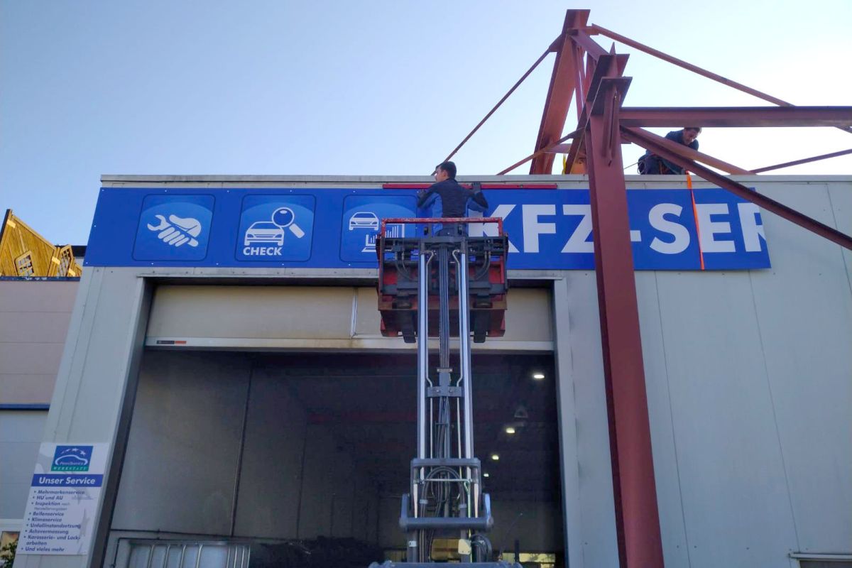 Montage Ihrer Innen- und Aussenwerbung durch unser Montageteam. Wir kümmern uns auch um evtl. notwendige Gerüste, Hubarbeitsbühnen, Hubsteiger, Krane oder sonstige Steighilfen. Mit unseren langjährigen Partnerfirmen decken wir auch alle weiteren evtl. notwendigen Handwerksarbeiten wie das Anlegen von Betonfundamenten, Baggerarbeiten, Beton- oder Maurerarbeiten, Pflasterarbeiten etc., Elektro- und Metallbau-Arbeiten ab. Sie brauchen sich um nichts zu kümmern. Wir bieten Ihnen hier eine umfassende Dienstleistung.