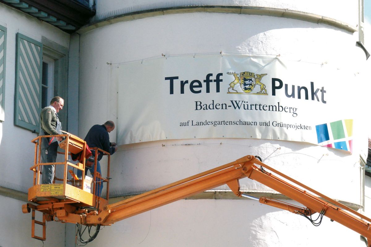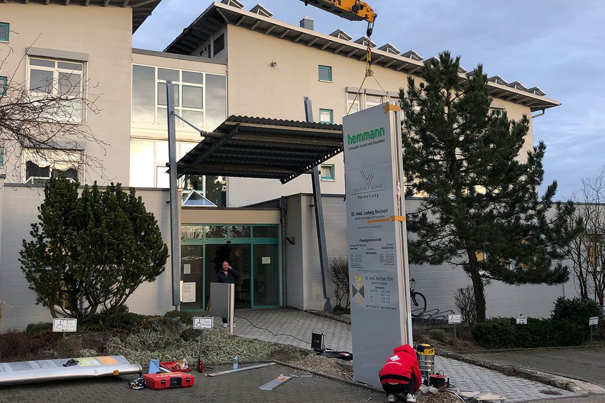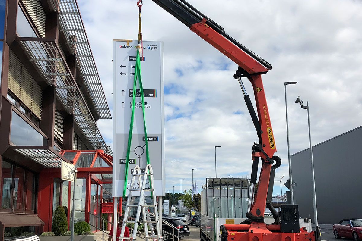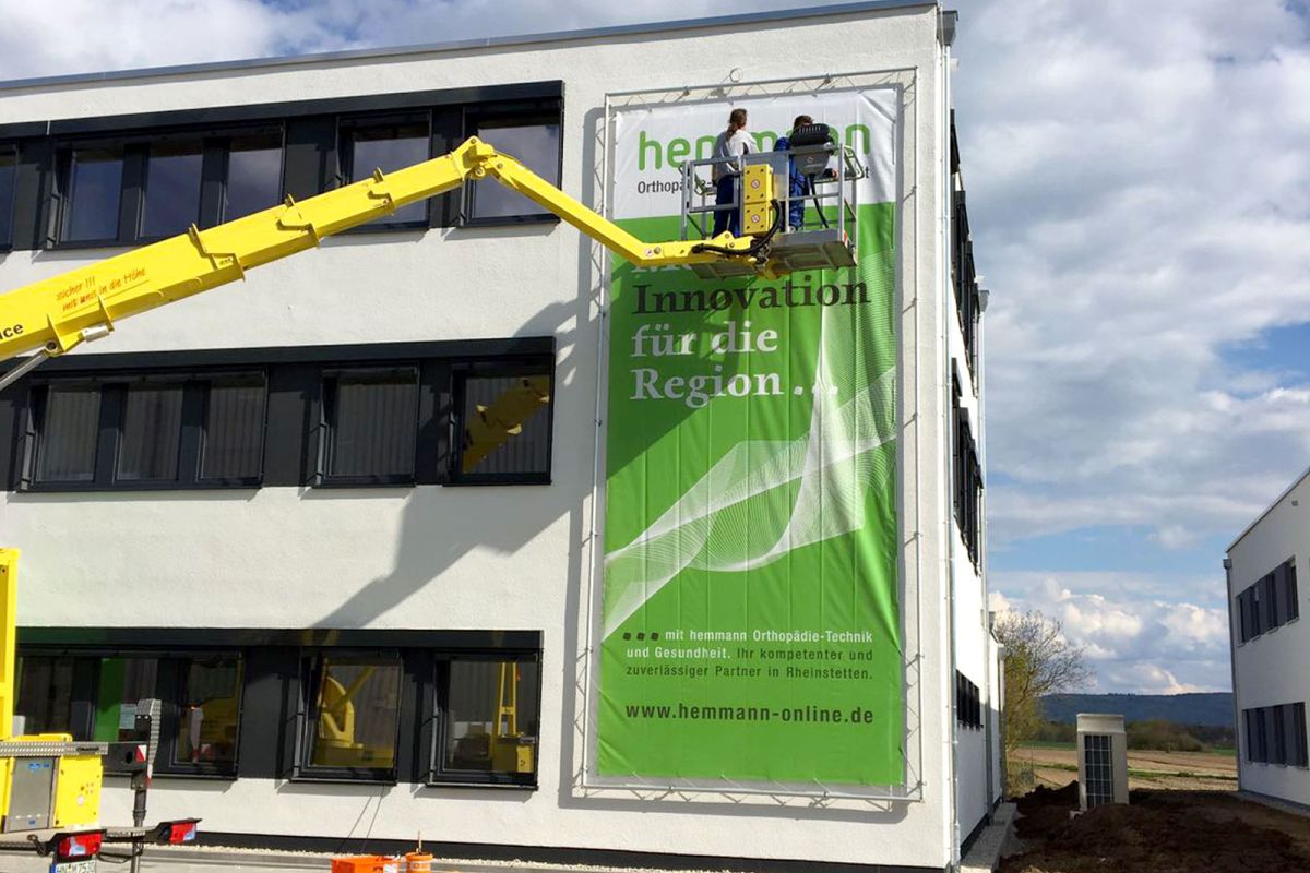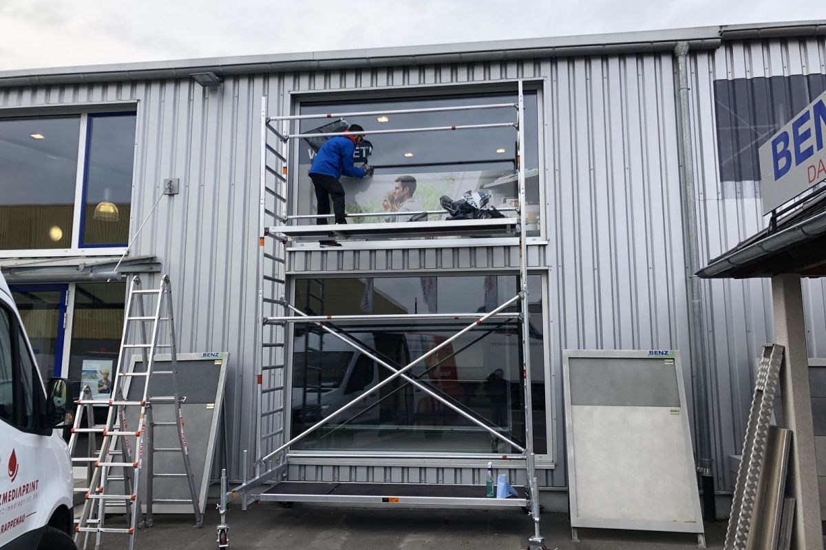 Montage Ihrer Innen- und Aussenwerbung durch unser Montageteam. Wir kümmern uns auch um evtl. notwendige Gerüste, Hubarbeitsbühnen, Hubsteiger, Krane oder sonstige Steighilfen. Mit unseren langjährigen Partnerfirmen decken wir auch alle weiteren evtl. notwendigen Handwerksarbeiten wie das Anlegen von Betonfundamenten, Baggerarbeiten, Beton- oder Maurerarbeiten, Pflasterarbeiten etc., Elektro- und Metallbau-Arbeiten ab. Sie brauchen sich um nichts zu kümmern. Wir bieten Ihnen hier eine umfassende Dienstleistung.